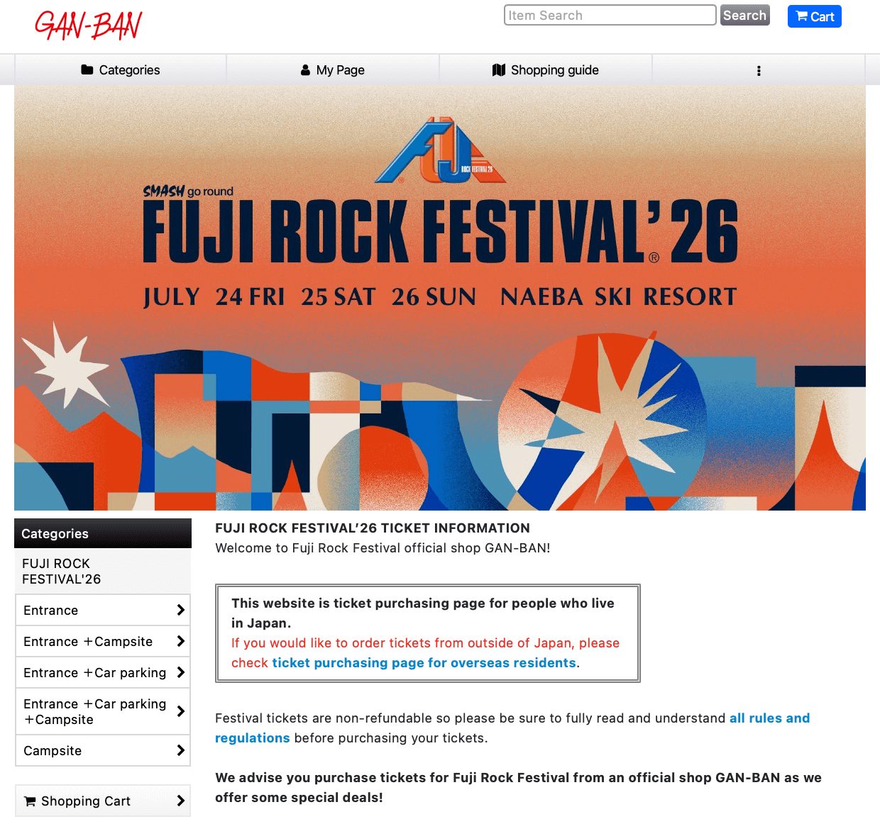 We advise you purchase tickets for Fuji Rock Festival from an official shop GAN-BAN as we offer some special deals!