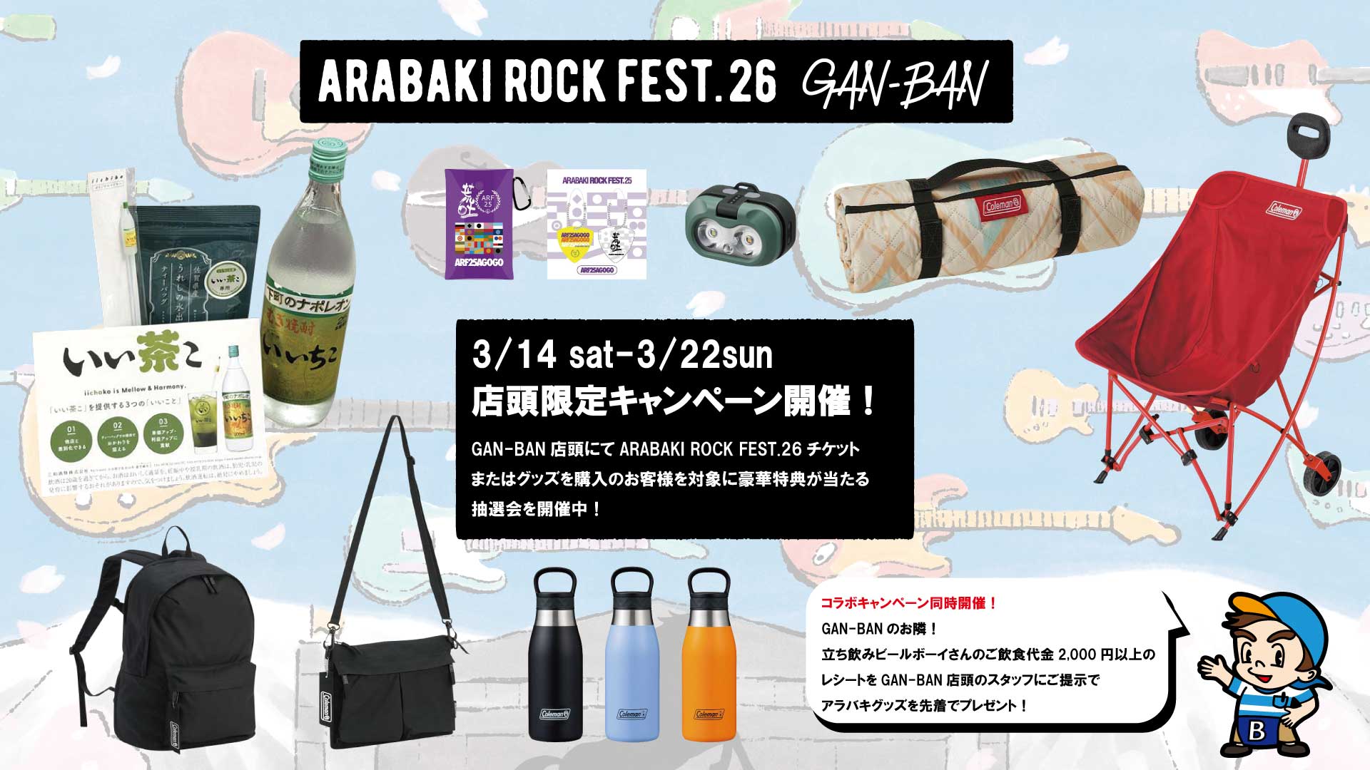 クラフトビールバー/立飲み居酒屋『立ち飲みビールボーイ』発行のご飲食代金税込み2,000円以上のレシートをGAN-BAN店頭のスタッフにご提示いただくと先着でARABAKI ROCK FEST.25『PVCマルチケース』または『ピック型キーホルダーセット』をプレゼント!